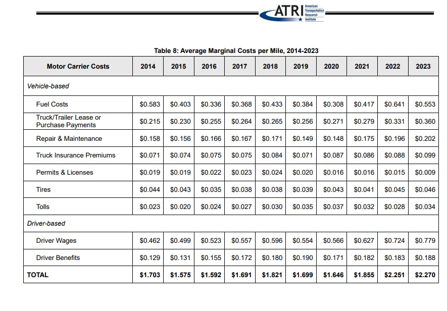 • Adds heavy truck maintenance costs from American Transportation Research Institute data (converted from dollars per mile to cents per mile by multiplying by 100)